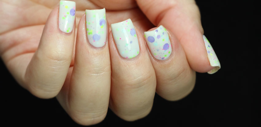 Today I have a polish from the new Delush Polish Life’s a Beach collection for summer 2015. This is Hip Hip Vacay, a milky white crelly with neon glitter and large purple/lavender circle glitter. Formula on this was near perfect.